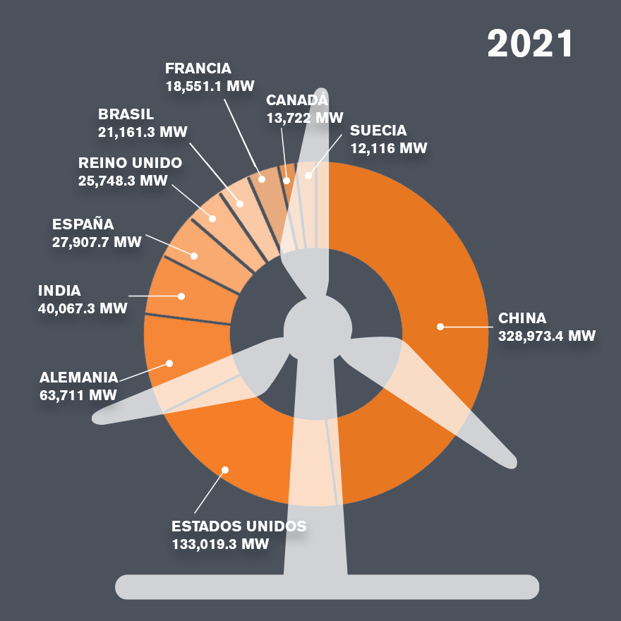En Europa, las instalaciones de Alemania aumentaron hasta los 62 201 MW gracias al plan de acción sobre el clima para 2030, con la energía eólica como actor fundamental en la reducción de las emisiones de gases de efecto invernadero, la energía eólica marina ganando terreno, unos mecanismos de fijación de precios del carbono favorables y la mejora de las infraestructuras. Todo esto está favoreciendo que las industrias adopten energías renovables y aumenten sus inversiones en energía eólica. A pesar de la desaceleración provocada por la pandemia, la India incrementó su capacidad de energía eólica hasta los 38 558,6 MW gracias al enfoque del Gobierno en los objetivos de las energías renovables, con entidades como el Ministerio de energías nuevas y renovables, que se encarga de perfeccionar las políticas de apoyo, y reguladores nacionales como la Comisión reguladora de la electricidad de Gujarat, que incorpora incentivos como la exención de las tarifas de transmisión y la eliminación de las tarifas fijas y genéricas para fomentar la licitación competitiva y la inversión del sector privado, mientras que una sólida base de fabricación nacional impulsaba aún más el crecimiento. España también mantuvo su impulso y logró una capacidad de energía eólica instalada de 26 819,2 MW gracias a la implementación del Plan nacional integrado de energía y clima de España (PNIEC) 2021-2030, la incorporación de políticas de apoyo, como el Real decreto-ley 23/2020, que agilizó los procesos de concesión de permisos y las normas de acceso a la red para los proyectos eólicos, los paquetes de estímulo económico como el Pacto verde y el Plan de recuperación de la UE, destinados a mitigar los efectos de la pandemia de COVID-19, y el aumento de la inversión en investigación y desarrollo para los proyectos eólicos marinos, en concreto, las aplicaciones flotantes.