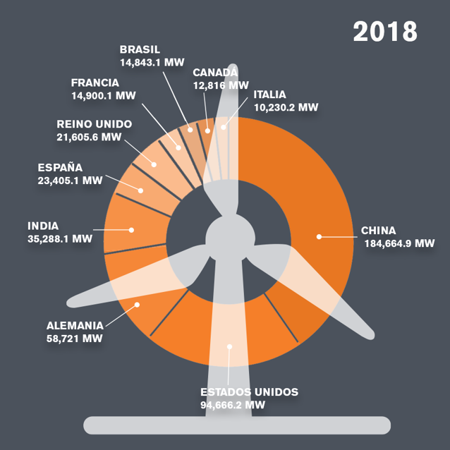 En 2018, China consolidó su dominio en el sector de la energía eólica con una excepcional capacidad instalada de 184 664,9 MW. Esta expansión fue posible principalmente gracias al sólido apoyo del Gobierno, que incluyó subvenciones e incentivos en virtud de la Ley de energías renovables, y a la disminución de los costes de fabricación e instalación. Las inversiones se vieron reforzadas por mejoras en la infraestructura de la red que contribuyeron a resolver los problemas de restricciones, especialmente en las regiones del norte. Estados Unidos ocupó el segundo lugar con 94 666,2 MW, algo más de la mitad del total de China, donde los avances en la eficiencia de las turbinas hicieron que la energía eólica fuera cada vez más competitiva frente a los combustibles fósiles. Medidas federales como el crédito fiscal a la producción (PTC) y las estrictas normas de la cartera renovable (RPS) de estados como California contribuyeron de manera muy importante al desarrollo de la energía eólica.