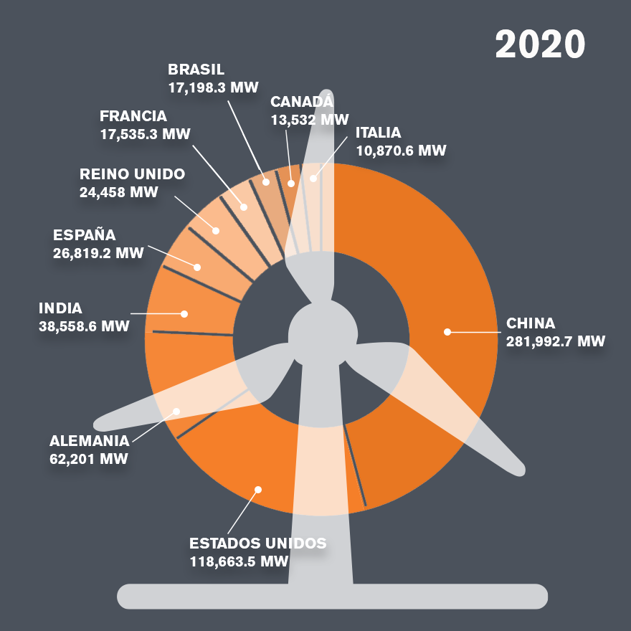 En medio de los retos, los obstáculos y las perturbaciones generalizados de 2020, el sector de la energía eólica siguió adelante, manteniendo su crecimiento y expansión a nivel mundial. A finales de año, el sector de la energía eólica de China se catapultó hasta niveles sin precedentes, alcanzando un récord de 281 992,7 MW que dobla el incremento del año anterior. Este extraordinario aumento se logró en gran medida gracias al compromiso inquebrantable del país con la energía verde, especialmente como parte de sus iniciativas de recuperación tras la pandemia de COVID-19, el inminente vencimiento de las subvenciones para proyectos eólicos terrestres, que hizo que los promotores aceleraran las instalaciones para cumplir con el plazo de final de año, y las innovaciones tecnológicas, como turbinas más grandes y eficientes, que contribuyeron a la rápida expansión de proyectos eólicos a gran escala. Mientras tanto, Estados Unidos mantuvo un crecimiento sustancial a pesar de los retrasos iniciales en los proyectos a causa de la pandemia, alcanzando una capacidad eólica de 118 663,5 MW, con medidas de estímulo y la ampliación de los incentivos de PTC que ayudaron a aumentar el número de instalaciones a finales de año. Al igual que en China, el inminente vencimiento de todas las ventajas del PTC en los EE. UU. provocó un récord en el número de instalaciones, ya que los promotores se apresuraron a aprovechar los incentivos. Además, la reducción de los costes de la energía eólica, junto con la creciente demanda de energía más limpia por parte de los consumidores y las empresas, impulsó aún más el desarrollo de grandes proyectos de energía eólica, especialmente en estados como Texas o Iowa.