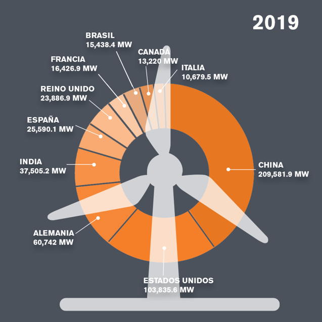 En 2019, momento en el que el sector de la energía eólica se consolidó, China logró adelantarse, ampliando su capacidad a 209 581,9 MW. Con las políticas energéticas nacionales centradas en reducir la dependencia del carbón e impulsar las energías renovables, y con fabricantes nacionales de turbinas como Goldwind y Envision que suministran turbinas rentables y eficientes, los promotores se apresuraron a completar los proyectos antes de la reducción de las tarifas reguladas para las instalaciones eólicas terrestres, lo que impulsó el crecimiento y las inversiones. Del mismo modo, Estados Unidos también avanzó, alcanzando los 103 835,6 MW, ya que los promotores tenían prisa por asegurar los proyectos antes de la próxima eliminación gradual del PTC. Además, la caída del coste de la energía eólica la hizo cada vez más atractiva tanto para las grandes empresas de servicios públicos como para las corporaciones con conciencia ecológica, y los gigantes corporativos como Walmart y AT&T aumentaron sus inversiones a través de acuerdos de compra de energía (PPA) para cumplir sus objetivos de sostenibilidad.