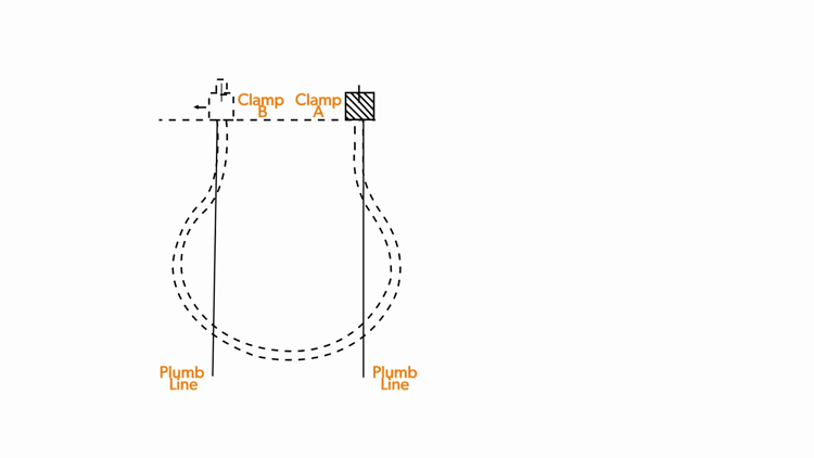 Once the Static Flexibility test begins, the movable Clamp B is moved away from the fixed clamp A until the loop formed by the cable takes the shape, indicated by the heavy outline, of the U. It remains enclosed wholly between two plumb lines through the clamps and set up tangentially to the external generatrix of the cable. The test is conducted twice with the cable being turned through 180° in the clamp after the first test.